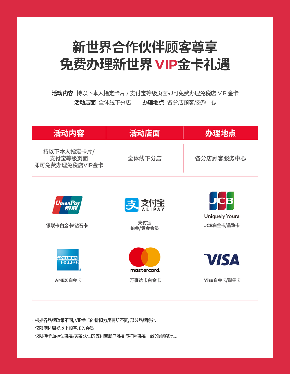 新世界合作伙伴顾客尊享 免费办理新世界 VIP金卡礼遇·