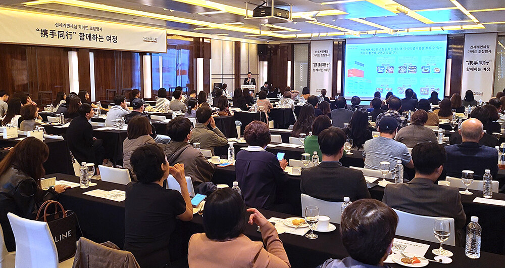 在韩际新世界免税店注册的中国跟团游导游共100名参加了此次名为“同行”的推介会。